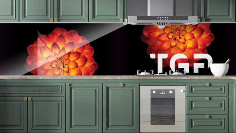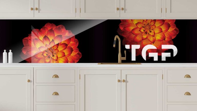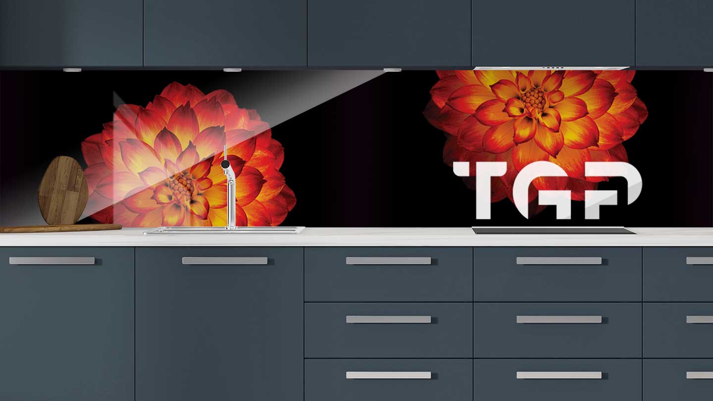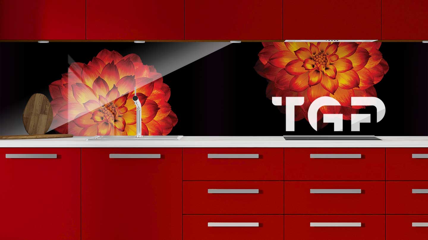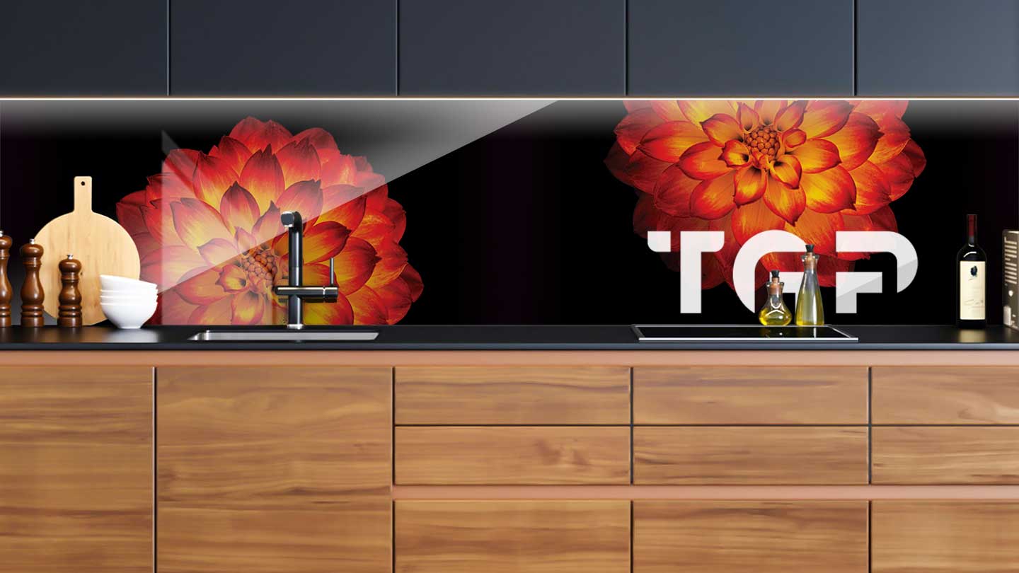 Panou sticla bucatarie, securizat termic după printare, nu este afectat de expunerea la apă, caldură sau solvenți, fiind ideal pentru protecția pereților din bucătărie.